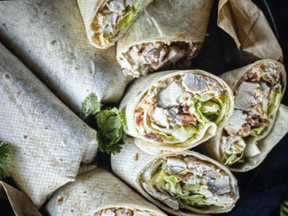 Roasted Chicken pieces, mixed with Mayonnaise, Lettuce served in a wrap.