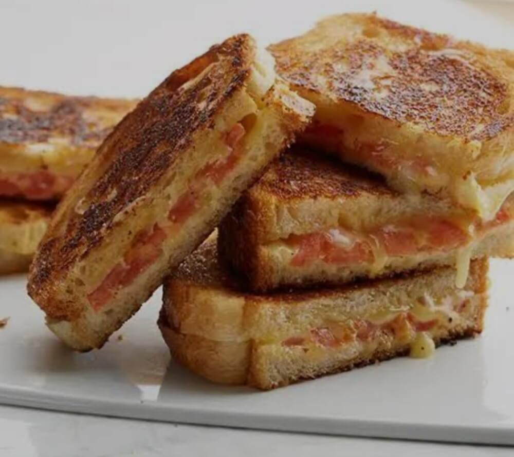 Slices of Tasty Cheese and Tomato Toasted in Sourdough Bread. Buttered with Nutlex Top and Bottom, then toasted.